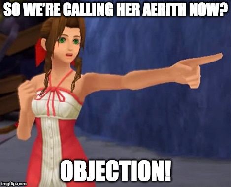 How could I not insert more than one Phoenix Wright meme with epic pointing like this? In some ways, this is even better because it's a statement I can wholeheartedly get behind. For starters when Final Fantasy VII was translated into English, the writers put in Aeris when in actuality it was supposed to be more like Aerith in Japanese. As sort of a course correction five years later they changed it back to Aerith when Kingdom Hearts was released.