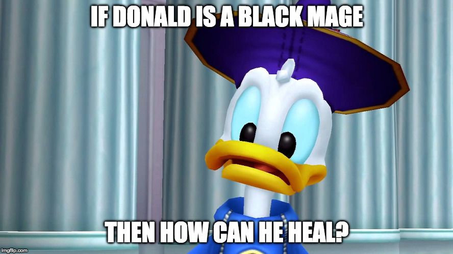Get ready to think. Okay so Donald is a Black Mage in Kingdom Hearts as you can see from his getup early on in Mickey's Castle plus his first rod literally has the head of a Black Mage on it. If that's the case then why can he heal? Black Mages, in the Final Fantasy games, can only use offensive magic. Sometimes they can use stat debuffs like Poison so in that regard Square Enix plays it fast and loose. Healing is never incorporated though. A Red Mage, on the other hand, is adept at both white and black magic. Wouldn't it make more sense to make Donald a Red Mage then? I guess the red would clash too much with Sora plus Donald's clothes have always been blue.